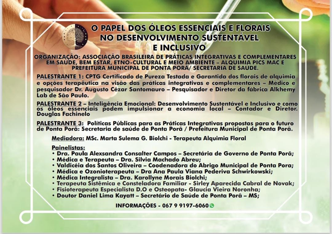 A Associação Brasileira de Praticas Integrativas e Complementares da Saúde e a Prefeitura Municipal de Ponta Porã promovem no próximo dia 29 de março, no Centro Internacional de Convenções Miguel Gomez – O Painel como é chamado este formato de evento que inicia ás 14 horas, este Painel contará com palestrantes vindo de outros estados do Brasil e este ano leva o tema, “O papel dos Óleos Essenciais e Florais no desenvolvimento sustentável e inclusivo”.